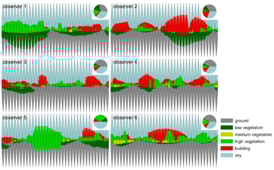 The transformed panoramic images were used for further calculations to determine the percentage distribution of each landscape feature in the entire 360° panoramic image. In order to automate the calculation process, a Python script was developed for counting pixels of different classes. It allowed us to calculate the percentage values of separated classes in accordance with the LAS 1.2. standard, which were shown as pie charts (Figure 6a). Additionally, the panoramic images were transformed into a stereographic projection, which enabled presentation of the results with so-called little planets (Figure 6b). In addition, the results can be presented independently for each landscape feature as low vegetation, medium vegetation, high vegetation (Figure 6c), buildings (Figure 6d), and sky.
