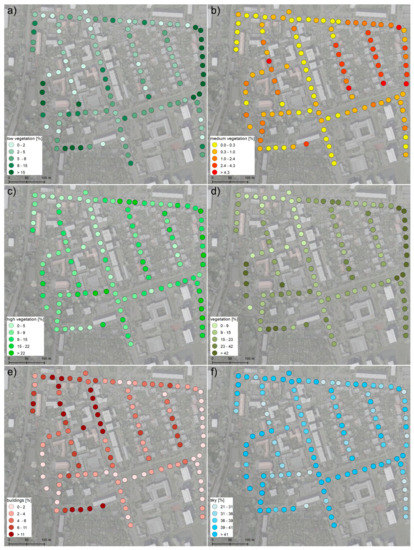 Percentage distribution of visible features in 360° field of view—low vegetation (a), medium vegetation (b), high vegetation (c), total vegetation (d), buildings (e), sky (f).