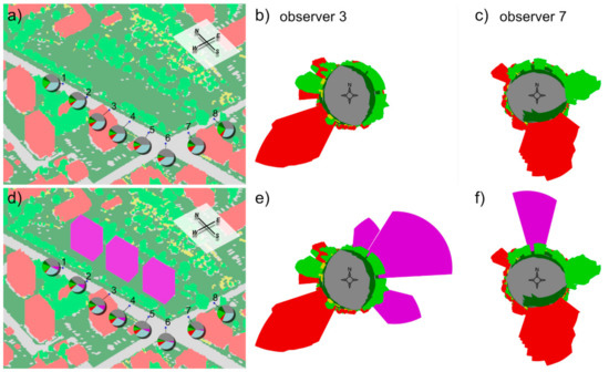 Working in the 3D environment of the Blender software makes it easy to add new objects that can be considered in the visual impact analysis. It can be very helpful for planning new infrastructure, expanding green infrastructure [41], planning decision support systems for smart cities [42,43], and for performing an environmental impact assessment of potential investments. For example, three potential buildings were added to the CDSM (Figure 10a) and assigned with a different material of known RGB values (Figure 10c). The analysis shows the visual impact of the new buildings on the observers located down the road. The mean visibility of the new buildings for eight observer locations equals 5.77% of the 360° field of view with a maximum of 9.71% for observer 3 (before Figure 10b and after Figure 10e building construction). A slightly different view is obtained by observer 7 where the buildings are visible from the side and mutually obscure each other (before Figure 10c and after Figure 10f building construction). The new buildings are not visible for observer 8, as they are obstructed by high vegetation. The average sum of the total buildings fraction increased from 7.09% to 12.8%.