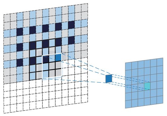 Specifically, for Resnet, our Refine Feature Pyramid Network only acts on the feature activation output by the last residual block output at each stage of Resnet, which are denoted as , , and . We all know that feature maps of the same size can be fused, so the high-level feature maps need to be up-sampled before being fused with the low-level feature maps. Interpolation and deconvolution are commonly used up-sampling methods. Ref. [23] used deconvolution to go from a low-resolution feature maps to a higher-resolution feature maps for fusion. However, unfortunately, deconvolution will produce uneven overlap (checkerboard artifacts) when up-sampling a feature map, as shown in Figure 5. The uneven overlap means that the convolution kernel operates more in some places than others. FPN uses nearest neighbor interpolation to obtain larger-sized feature maps, but it produces aliasing effects. In fact, convolution can filter out aliased high-frequency signals. Therefore, we use a combination of nearest neighbor interpolation and convolution instead of deconvolution or simple interpolation, which will effectively reduce the checkerboard effect or aliasing effect. Moreover, we use a convolution (which can reduce channel dimensions) and a convolution to further extract the low-layer detailed location information, and the ReLU layer is applied between the two convolution layers to obtain the non-linear representation. Then, we fuse the high-level semantic features with the low-level location features through element-wise addition, and obtain the merged map through a convolution and two ReLU layers. This process is repeated until the finest resolution feature map is generated. Finally, we obtain a set of multi-scale feature maps corresponding to the merged maps of each layer, which is defined as . It is worth noting that is obtained by through a convolution and a convolution, which is the same way as in FPN.