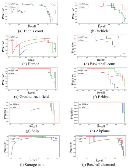 The P-R curves of RADet and other classical object detection algorithms on NWPUVHR 10 dataset. (a) P-R curves on Tennis court category. (b) P-R curves on Vehicle category. (c) P-R curves on Harbor category. (d) P-R curves on Basketball court category. (e) P-R curves on Ground track field category. (f) P-R curves on Bridge category. (g) P-R curves on Ship category. (h) P-R curves on Airplane category. (i) P-R curves on Storage tank category. (j) P-R curves on Baseball diamond category.