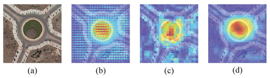 Qualitative analysis of Multi-layer Attention Network. Due to the complexity of real-world data such as remote sensing images, there will be a lot of noise information near the objects. Extensive noise will overwhelm the object information and the boundary between objects will be blurred, as shown in Figure 10b, leading to missed detection and increasing false alarms. It can be seen from Figure 10c that our proposed Multi-layer Attention Network can effectively suppress background noise and highlight object information, which is helpful to improve the final detection performance of the model. In addition, it can be seen from Figure 10d that due to the position attention block, the proposed RADet can pay attention to some information around the swimming pool, such as small vehicles and houses, which greatly helps the precise positioning of the swimming pool.