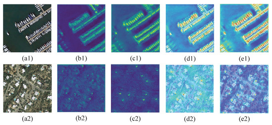 Visualizations of Multi-layer Attention Network. (a1,a2) The input images. (b1,b2) The input feature maps of Multi-layer Attention Network. (c1,c2) The output feature maps of Multi-layer Attention Network. (d1,d2) The heatmaps of the input feature maps of Multi-layer Attention Network. (e1,e2) The heatmaps of the output feature maps of Multi-layer Attention Network.