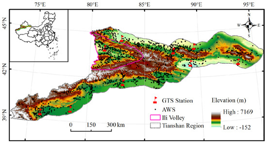 Digital elevation model (DEM) and distribution of the observation stations on a map of the Tianshan Mountains. The black dots and red flags represent automatic weather stations (AWSs) and Global Telecommunication System (GTS) stations, respectively.