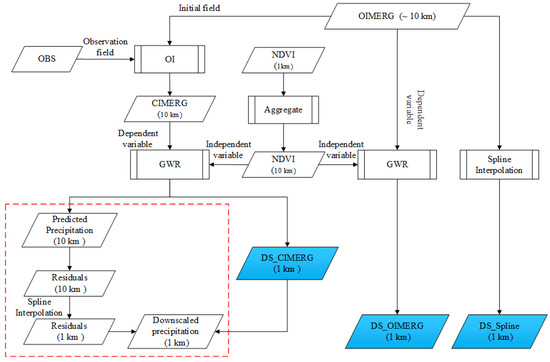 The flow chart of this study. The red dashed box indicates the residual correction process, and the blue boxes represent the three categories of downscaling estimation data. OIMERG, original Integrated Multi-satellitE Retrievals for GPM; OBS, observed precipitation data; OI, optimum interpolation; NDVI, normalized difference vegetation index; CIMERG, OI-corrected IMERG precipitation data; GWR, geographically weighted regression; DS_CIMERG, obtained via GWR downscaling with CIMERG; DS_OIMERG, obtained via GWR downscaling with OIMERG; DS_Spline, obtained by using the spline interpolation method for OIMERG precipitation downscaling.