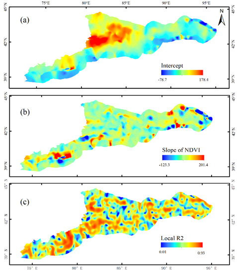 The spatial distributions of the (a) intercept, (b) slope of the NDVI and, (c) local R2 in July 2016.