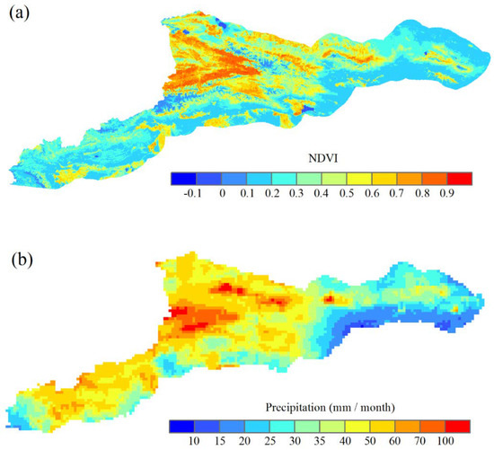 (a) The monthly average NDVI and (b) the monthly average IMERG during the warm season of 2016.