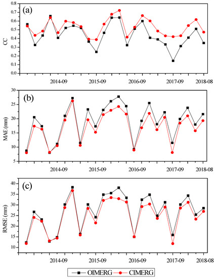 Figure 5 shows comparisons of the CC, MAE, and RMSE values calculated before and after the OI-based merging of the OIMERG data and the observation data. After OI, the CC values increased in almost all months; this effect was the most obvious for September 2017, with an increase of 0.27. The CC was slightly worse after OI for only two months: by 0.01 for May 2014 and by 0.02 for August 2014. In addition, the RMSE generally decreased by 0.37–5.16 mm, with slight increases observed for only two months (by 0.06 mm for September 2016 and by 0.23 mm for August 2014). The MAE decreased in all months except August 2014, for which it increased by 0.17 mm. Overall, compared with the OIMERG precipitation data, the CIMERG data obtained after OI showed improvements in the mean CC, RMSE, and MAE values from 0.516, 28.83 mm, and 19.73 mm to 0.616, 26.56 mm, and 17.59 mm, respectively. Therefore, the OI processing of the OIMERG and observed precipitation data greatly improved the precision of the original satellite precipitation product.