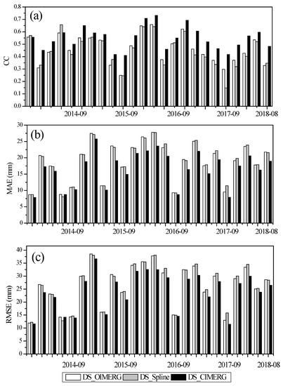 Based on the improvement in the quality of the satellite precipitation product after OI, the downscaling effect of the GWR method was further validated. Figure 6 shows comparisons among the downscaled data obtained with three different downscaling methods for May to September of 2014–2018. DS_CIMERG had the highest CC values in 22 of the 24 months, with lower values than those of DS_Spline only in May and August 2014. On average, the mean CC of DS_CIMERG was 10% higher than that of DS_Spline. Between DS_Spline and DS_OIMERG, the CC values of DS_Spline were higher in 8 months and lower in 16 months, suggesting that the quality of satellite precipitation data cannot be effectively improved by downscaling with only the spatial interpolation technique. The RMSE and MAE values of DS_CIMERG were the lowest in almost all months. Furthermore, the mean CC, RMSE, and MAE values respectively improved from 0.616, 26.56 mm, and 17.59 mm for CIMERG to 0.635, 25.93 mm, and 17.15 mm for DS_CIMERG, respectively.