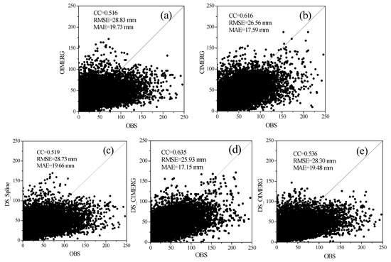 Scatter diagrams of the (a) OIMERG, (b) CIMERG, (c) DS_Spline, (d) DS_CIMERG, and (e) DS_OIMERG precipitation products against the observed precipitation during the warm seasons from 2014 to 2018. OIMERG, original IMERG precipitation data; CIMERG, OI-corrected IMERG precipitation data; DS_Spline, obtained by using the spline interpolation method for OIMERG precipitation downscaling; DS_CIMERG, obtained via GWR downscaling with CIMERG; DS_OIMERG, obtained via GWR downscaling with OIMERG; OBS, observed precipitation data.