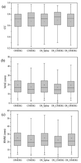 Figure 8 shows boxplots of the evaluation metrics for the five precipitation products. A boxplot divides a dataset into four segments based on the maximum, minimum, median, and two quartiles of the data. The middle horizontal line represents the median, which divides the statistical data into two equal parts. As shown in Figure 8, the distributions of the CC, MAE, and RMSE were all uniform and consistent. Among the five datasets, the best performance was observed for DS_CIMERG, whose CC values were more concentrated in the upper region, while the MAE and RMSE values were more concentrated in the lower region. In particular, the minimum and maximum MAE and RMSE were the lowest for DS_CIMERG, followed by CIMERG. The metrics for OIMERG and DS_Spline were basically the same, while those for DS_OIMERG were in agreement with the overall assessment results and slightly better than those for OIMERG (Figure 7). In Figure 8, the small rectangular boxes represent the distributions of the metric values around their averages. DS_CIMERG performed the best among the five products, with CC, MAE, and RMSE values of 0.70, 17.29 mm, and 22.45 mm, respectively. The overall evaluation results showed that the dataset generated using the OI-GWR method proposed in this study was notably superior to the datasets of the other two downscaling products as well as the initial IMERG precipitation data.