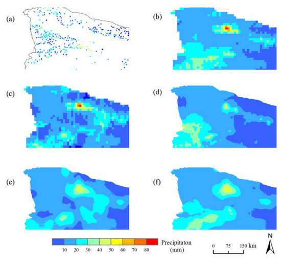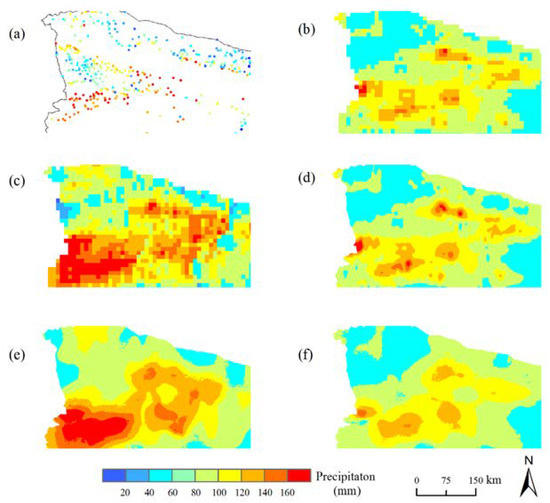 Enlarged views of the Ili Valley corresponding to Figure 11. (a) OBS; (b) OIMERG; (c) CIMERG; (d) DS_Spline; (e) DS_CIMERG; (f) DS_OIMERG.
