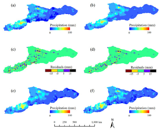 Using DS_CIMERG as an example, the residual correction processes for GWR downscaling in July 2016 and September 2017 were analyzed, and the results are shown in Figure 13; Figure 14, respectively. Figure 13a shows the CIMERG data before downscaling. Figure 13b shows the estimated precipitation based on the low-resolution (10 km) regression coefficients (i.e., Predicted Precipitation (10 km) in Figure 2). Figure 13c shows the 10-km residuals obtained by subtracting CIMERG from the 10-km precipitation predictions. Figure 13d shows the 1-km residuals obtained after applying the spline interpolation technique to the 10-km residuals. Figure 13e shows the DS_CIMERG precipitation estimates, which are based on the high-resolution (1 km) regression coefficients. Finally, Figure 13f presents the residual-corrected downscaling results obtained by summing the 1-km residuals and the 1-km precipitation estimates. As shown in this figure, the precipitation estimates (Figure 13b) obtained with the low-resolution parameters already exhibited high consistency with CIMERG (Figure 13a), and their residual values were generally small, ranging between -10 and 10 mm (Figure 13c), indicating that the low-resolution estimated precipitation data obtained via the GWR method were close to the initial precipitation data. In contrast, the high-resolution precipitation estimates obtained based on the 1-km regression coefficients (Figure 13e) not only were highly consistent with the initial precipitation distribution but also reflected the detailed structure of the precipitation distribution. The results shown in Figure 14 are similar to those in Figure 13, except that they correspond to a different month. Table 2 summarizes the detailed error statistics. The CC, RMSE, and MAE values after residual correction were worse than those before residual correction. Therefore, the addition of residual correction to the GWR model transferred the errors of the original IMERG precipitation data to the final downscaling outcomes, thereby decreasing the reliability of the outcomes, as the residuals were obtained by subtracting the 10-km precipitation predictions from the original IMERG precipitation data.