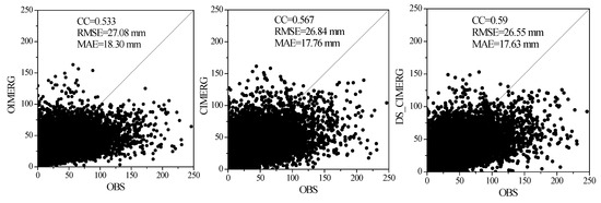 Scatter diagrams of OIMERG, CIMERG, and DS_CIMERG against the observed precipitation during the warm seasons from 2010 to 2018.