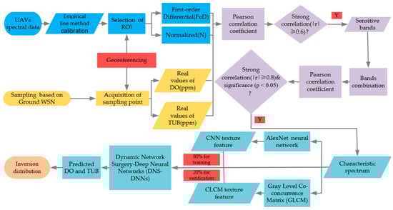 The method that we are proposing can be structured according to the following steps: UAVs overflight with multispectral cameral and processing of spectral data; Ground WSN water quality data collection and processing; Characteristic spectrum acquisition based on correlation analysis; training and vertification of the DNS_DNNs; and inversion of DO and TUB. The flowchart of the proposed method is depicted in Figure 1 and detailed in the following items.