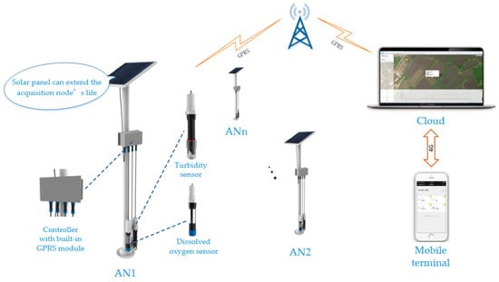 The ground WSN acquisition node (AN) consists of DO sensor, TUB sensor, solar panel and system control box internally equipped with GPRS communication module, as shown in Figure 3, and it can monitor the water quality of aquafarm in real time. The system control box has a built-in STM32F407 controller, GPRS communication module and RS485 interface accessories, which were burnt with the sensor driver and communication algorithm program. In order to continue field operation, the acquisition controller used solar panels made of monocrystalline silicon as the power supply. The acquisition interval is 3 min/time. If the battery is fully charged, its time of endurance is more than two days. The collected data are uploaded to the cloud for analysis and processing, and sent to the mobile terminal software for display. The measured value of water quality monitoring can be exported from the mobile terminal.
