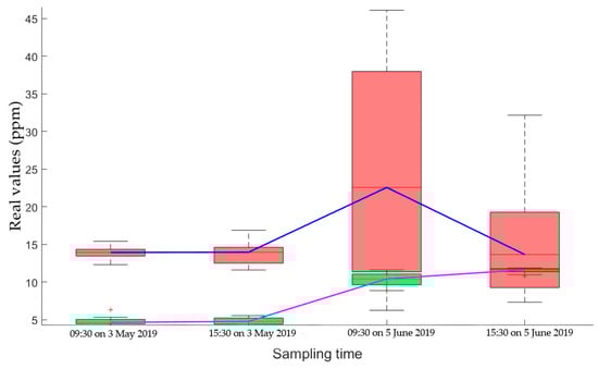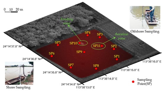 There were an aeration zone and a feeding zone in the study area. In order to reflect the diversity and representativeness of the sampling points, a total of 11 sampling points were set, including 3 offshore sampling points (SP9–SP11) and eight shore side sampling points (SP1–SP8). Combining with the ground measured data obtained by the developed ground WSN equipment, the test site and ground data sampling points are shown in Figure 5. The statistical distribution of the real values of DO and TUB during the four sampling times were shown in Figure 6, where .