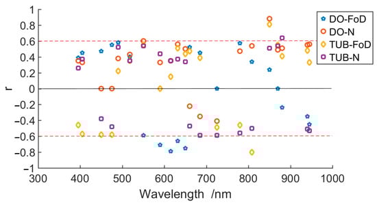 To establish an inversion model with high accuracy, the Pearson correlation coefficient was carried out to the measured DO and TUB and the normalized (N) and first-order differential (FoD) water spectral reflectance to obtain the sensitive bands of DO and TUB. The correlation coefficient is shown in Figure 7.