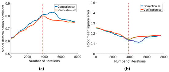 As provided in Figure 8, when the number of iterations was selected as 3819 by using the early stop method, the model determination coefficient of the verification set reached the maximum, the root-mean-square error reached the minimum, and the model’s comprehensive performance was the best.