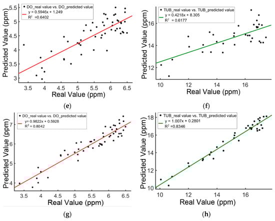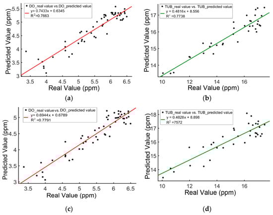 The data of verification set was imported into each conventional model and DNS-DNNs model to predict the concentration values of DO and TUB, which were linearly fitted with the measured values. The test results are shown in Figure 9.