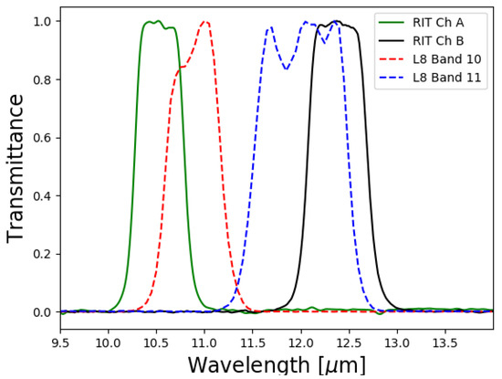 Radiometer spectral response for Channel A and B centered at 10.6 m and 12.33 m respectively, and for Landsat 8 band 10 and 11 centered at 10.9 m and 12.0 m, respectively.