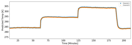 A dwell test was performed to estimate the prototype radiometer’s change in radiance corresponding to one unit of change in temperature, known as Noise-Equivalent Change in Temperature (NET), at three blackbody temperatures (283, 293, 303 K). A final measurement at 283 K was repeated at the end of the test to characterize potential drift in the system. Referring to Figure 3, measurements were obtained for each temperature for approximately one hour and the NET was calculated as the standard deviation of the collected data at each temperature. Table 2 shows the average difference between the predicted versus actual blackbody temperatures (in column 2) and the corresponding NET values (in column 3) for the prototype radiometer. Table 2 illustrates that, in this lab test, the prototype radiometers are able to measure the blackbody temperature to within 1.28 K of the actual temperature and exhibit an NET of approximately 0.20 K across a range of temperatures (283, 293, 303 K). Figure 3 also shows that the system is stable, based on the repeatability of predicting the 283 K temperature at the end of the test.