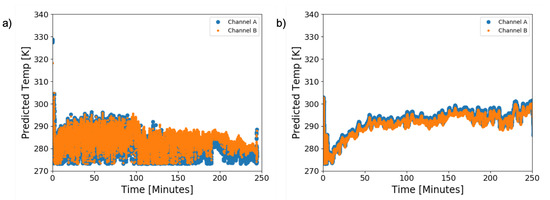 As seen in Figure 4a, without wind protection and solar loading reduction, the temperature prediction varied by as much as 20 K from sample to sample. After the modifications for wind protection and temperature stabilization were included (Figure 4b), the temperature variation between samples reduced to approximately 5 K.