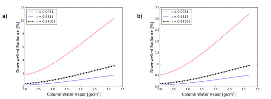 Figure 5a,b depict the downwelled radiance contribution as a percent of the total sensor-reaching radiance. From the initial MODTRAN run of 1020 atmospheric profiles, it was apparent that the pre-defined atmospheres (mid-latitude summer, mid-latitude winter, tropical) and height of the sensor had little impact on the overall percent of downwelled radiance (less than 1%). Therefore, only the results for the mid-latitude summer atmosphere (most closely represented the RIT field collect site) and a sensor height of 3 m are displayed in the figures. The column water vapor was found to be the largest influence on the downwelled radiance contribution. The percent of downwelling radiance is shown as a function of column water vapor and as a function of target emissivity and temperature. The downwelled radiance results from the maximum (bottom curve) and minimum (top curve) target emissivities bound the range of possible emissivity values. However, from Section 2.3 the expected emissivity values for the target field for this study are 0.970 for Channel A and 0.962 for Channel B (closer to the maximum emissivity curve).