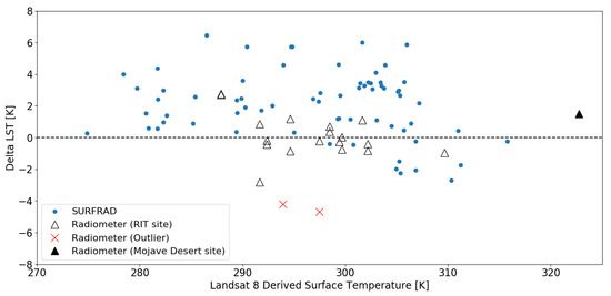 The point at a Landsat 8-derived surface temperature of 322.7 K, shown as a solid triangle, was collected by the radiometer in the Mojave desert California rather than the RIT site. The sand and sparse vegetation of the Mojave desert landscape is much different than the field at RIT (grass) so new emissivity coefficients were derived using the ASTER-GED database (Section 2.3). Testing against a different target than the RIT field and getting a temperature error of 1.49 K, displayed the feasibility of using the radiometer in multiple environments over different types of surface targets. The surface temperature of the Mojave site (50 C) was outside the range of the radiometer lab calibration (0–45 C), demonstrating that the radiometer can be accurate over a larger temperature range.