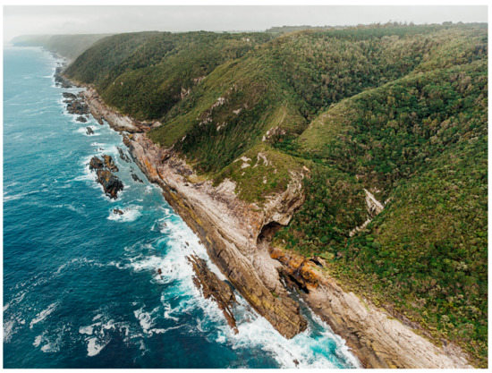 Aerial drone photo of a cave eroded in synclinal folds of the Table Mountain Group quartzites, bordering the Tsitsikamma indigenous forest along the southern coast (Figure 1 for location; see http://aeon.org.za/remotesensing/ for drone video). The flat erosion surface elevated at more than 200 m above sea level is a wave-cut platform that records southern Africa uplift and fluctuated global sea-level drop since about 100 Ma.
