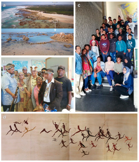 Indigenous Knowledge (IK) documentation through Koi-San research at !Nau-Omkhai ku Dara: (a) Fish-traps at Cape Recife nature reserve, some of the earliest human changes to the ecosystem along the coastline (drone data across these traps is shown at “Mandela Talks’ [4]); (b) Khoisan chiefs debating their socio-cultural challenges in AEON’s Commons; (c) youth engaging in discussions concerning their future career with AEON’s masters and doctorate graduates at Nelson Mandela University; and (d) rock painting, copied and first published by geologist George Stow [16].