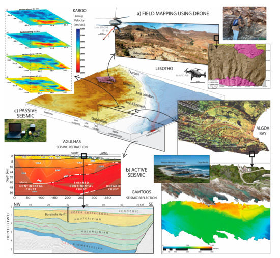 The construction of geological maps requires extended periods of fieldwork, often camping, while exploring remote locations, thereby making essential engagement with the local community, farmers and traditional leaders (chiefs). For example, our work in the Drakensberg and Lesotho Mountains has led to the recent discovery of pillow lava structures, which attests to a marine environment linked to the opening of the Indian Ocean some 180 Ma [29]. These rock formations are preserved at present-day elevations of more than 1700 m, making it difficult to fit into current plate tectonic models and sea-level changes. More fieldwork with many students is needed to map and accurately date the evolution of this paleo-coastline that holds important implications for our understanding of the geomorphology and uplift history (epeirogeny) of the studied region.
