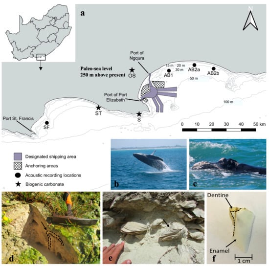 Soundscape ecology and geochemical studies of St. Francis and Algoa Bay, near Port Elizabeth: (a) Map showing the location of acoustic loggers and biogenic carbonate samples; (b) humpback whale (Megaptera novaeangliae) calf; (c) southern right whale (Eubalaena australis) calf; (d) stromatolites (site S); (e) Plio-Pleistocene oyster fossils (Striostrea margaritacea; site OS); and (f) modern shark teeth (Carcharodo carcharias; site ST).