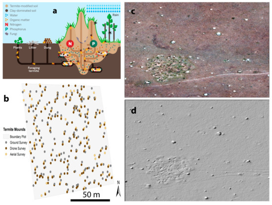 Spatial distribution of termite mounds across a 2,000 m2 surveyed area of the Karoo, near Cradock (Figure 1 for location): (a) Architecture of a termite mounds [47]; (b) map using ground, drone and satellite image surveys; (c) ortho-mosaic; and (d) digital surface model.
