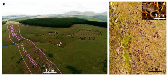 Endemic animals in this area are characterised by small body size and low mobility. This is the case, for instance, for the legless skink (Acontias breviceps), two frogs (the Hogsback chirping frog Anhydrophryne rattrayi and the Hogsback caco Cacosternum thorini), and a small toad (the Amatole toad Vandijkophrynus amatolicus [48]). The recent discovery of the Hogsback caco (Cacosternum thorini) shows how the local geology influences species diversity and offers an opportunity for collaborative research involving remote sensing, and specifically for drone data capture. These tiny (15 mm) frogs, identifiable by their unique, diagnostic call, are found in a very small area around Tor Doone [49]. They inhabit the very rare and localised habitat of deep oligotrophic pools in high altitude peatland. In this case, it is found immediately behind a 20 m thick, subvertical Karoo dolerite dyke that forms a natural barrier in the drainage system (Figure 7a), allowing the pools to remain full for several weeks and thereby creating the preferred habitat of the frogs (Figure 7b). Because each pool is defended by a single male (Figure 7c), drone surveys are being used to count the pools in order to estimate the population size and their changes during climate variability.