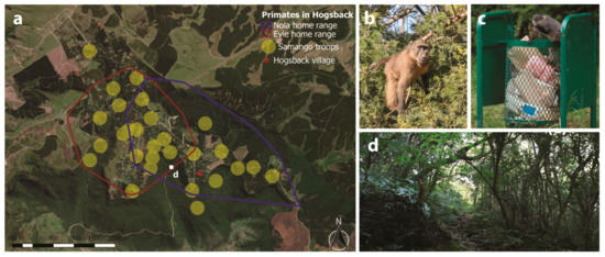 Baboon and samango troops living in Hogsback: (a) Distribution map; each yellow circle represents a samango troop core area; red and blue polygons represent the maximum home range extension for the two baboon troops studied over 10 years. (b) Juvenile baboon on black wattle tree (Acacia mearnsii); (c) samango monkey eating from an uncovered trash bin; and (d) indigenous forest.