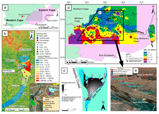 Mapping surface and ground waters of southern South Africa: (a) Location map of these baseline studies (hatched areas) and the two testing sites (red boxes); (b) measured Uranium (U) concentration levels along the Rietkuil drainage near Beaufort West, with a satellite image showing the mined pit, stockpiles, and farmhouses; (c) groundwater recharge map of a wetland at Rietvlei, near Cape Town; (d) interpolated Electrical Conductivity (EC) measurements of groundwater in the southern Karoo; and (e) isotopes signatures in groundwater samples (purple circles) near Jansenville that show mixing of old/deep saline waters with recent/shallow freshwaters (pCM = Percent Modern Carbon; TU = Tritium Units).