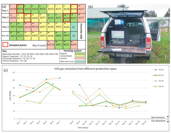 Comparative study of CO2 emissions between conventional and organically-farmed soils: (a) Farming system showing the four sampled plots; organic and conventional plots are sampled on the same day and at the same time. (b) Picarro G2201-I gas analyzer used in this study; and (c) CO2 emissions (in ppm) measured in July and August 2018; first seven days were during dry soils, and last eleven days was during moist soils following rainfall. Results revealed that conventional farming emit more CO2 than organically-farmed soils, and that soil respiration and emission are inhibited by high moisture content. Similar measurements of CH4 were also included (not shown here).
