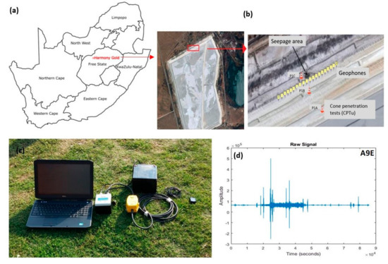 Passive seismic study of a mine tailing dam stability: (a) Location map of Harmony Gold; (b) aerial views showing the surveyed portion of the wall (red box) and the geophones positioned near an area where a seepage was detected; (c) instrumentation used to record the ambient noise; and (d) example of raw signal from one of these recording stations.