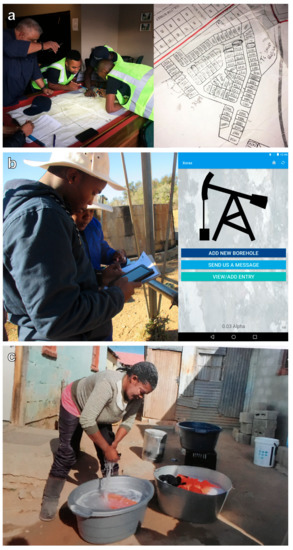 Citizen Science and household surveys in Karoo communities: (a) AEON researcher studying maps with fieldworkers of the housing department and a human settlement map in Jansenville; (b) hydrocensus trainees at a borehole site and the Xoras App interface; and (c) washing clothes using bucket systems in Lingilihle Township near Cradock. See Figure 1 for locations.