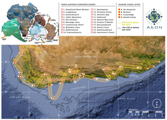 Landscape archeology that is based on evidence of early human habitation is unique across the studied region (Figure 1 and Figure 2). Here, the earliest evidence of our cultural evolution have been re-discovered, including: Acheulean stone tools (e.g., Montagu Cave, 500–200 ka); the oldest known engraved rock and some necklace beads made from gastropod shells (Blombos Cave, 75 ka); a variety of ostrich eggshell containers (Diepkloof Rock Shelter, 65–55 ka) [12,13]; and the earliest human footprints along sand dunes (Langebaan, 117 ka) [14]. These, together with the dated sedimentary records, reveal strong relationships between human evolution, sea-level and climate changes, with the most important modifications occurring during intervals of maximum glaciation (‘ice ages’), such as the Cape coast is envisaged to represent the cradle of human culture.