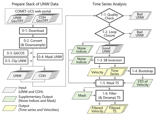 Here, we provide a brief LiCSBAS overview prior to the detailed description presented in Section 2.3, Section 2.4 and Section 2.5. The workflow of our InSAR time series processor is largely divided into two parts: preparation of a stack of unwrapped data (Step 0) and time series analysis (Step 1; Figure 1). LiCSBAS starts with downloading the LiCSAR products covering the area of interest (Step 0-1) and is followed by data format conversion (Step 0-2). Tropospheric noise correction using the external Generic Atmospheric Correction Online Service for InSAR (GACOS) data [38] (Step 0-3) and masking (Step 0-4)/clipping (Step 0-5) the unwrapped data are optional steps that can be carried out to improve accuracy and make processing more efficient. In the time series analysis, incorrectly unwrapped data, which degrade the results, are identified and discarded based on the coherence and coverage of the unwrapped data (Step 1-1) and by checking loop closure (Step 1-2). The refined stack of unwrapped data is inverted to obtain the displacement time series and velocity (Step 1-3), followed by estimation of the velocity standard deviation (STD) (Step 1-4) and masking of noisy pixels based on several noise indices (Step 1-5). Finally, a spatiotemporal filter is applied to the time series to mitigate the residual noise and derive the filtered time series and velocity (Step 1-6). All steps can be executed from the command line or using a batch script with defined parameters. The derived results (i.e., velocity and time series) can be easily displayed by an interactive time series viewer and exported to GeoTIFF, KMZ, or text format.