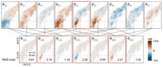 Example of the loop closure for the region of the Echigo plain, Japan (Section 4). Top and bottom row images are interferograms consisting of five images and loop phases calculated from the interferograms by Equation (1), respectively. Black and red lines between them denote which three interferograms are used to calculate each loop phase. Three loop phases with a red frame () have areas with ±2π phase and a large (>2 rad) root mean square (RMS). Then, the interferogram with a red frame can be identified as a bad interferogram including significant unwrapping errors, because all loops associated with it are problematic, whilst the other interferograms generate at least one nonproblematic loop.