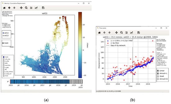 LiCSBAS is equipped with an interactive time series viewer composed of two windows (graphical user interfaces). The first image window displays velocity, cumulative displacements, and noise indices (Figure 4a). When clicking on a pixel of interest, the associated time series with and without the spatiotemporal filter is promptly plotted in the second time series window (Figure 4b). Any network gaps are clearly displayed, which alerts the user to carefully interpret the time series connected by the temporal constraint (see Section 2.4.3). The reference area is shown by a black rectangle, and it can be interactively changed and examined in the image window.