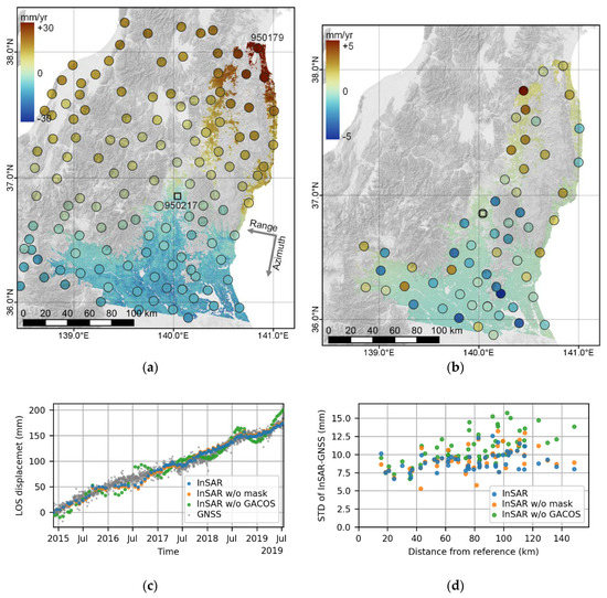 Regarding the result of the LiCSBAS processing, without the GACOS correction, the overall velocity is quite similar, and the STD of the difference in LOS velocity between InSAR and GNSS is 2.4 mm/yr, which is slightly larger than that with the GACOS correction (1.9 mm/yr; Figure 8).