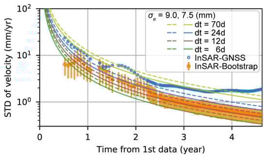 The temporal evolution of the InSAR-GNSS and InSAR-bootstrap STDs are largely consistent with the theoretical velocity uncertainty model calculated using Equation (4) with of 9.0 mm or 7.5 mm (calculated in Section 3.2 by comparison with GNSS), respectively, and a sampling interval () of 24 days for ~2.3 years (i.e., until February 2017; Figure 9). An excursion in InSAR-GNSS STDs around 1.5–2.0 years (i.e., May to November 2016) might be caused by residual noise in the InSAR time series (Figure 6c, Figures S5 and S6). The STD of InSAR-GNSS converges to ~2 mm/yr, not 0 mm/yr, presumably because of a contribution from colored noise components in InSAR and/or GNSS [63] or discrepancies in the location of the measurement points between InSAR (i.e., coherent sum of the scatters in each resolution cell) and pointwise GNSS.