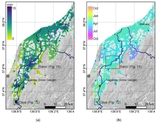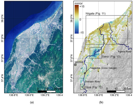 Inland areas within this frame are mostly mountainous and covered with dense vegetation. Furthermore, it snows during winter months. Therefore, it is quite difficult to obtain the full time series using C-band SAR data due to severe decorrelation. There are several plains and urban areas that are suitable for C-band data: the Kanto Plain in the south and the Echigo Plain in the northwest (Figure 5a).