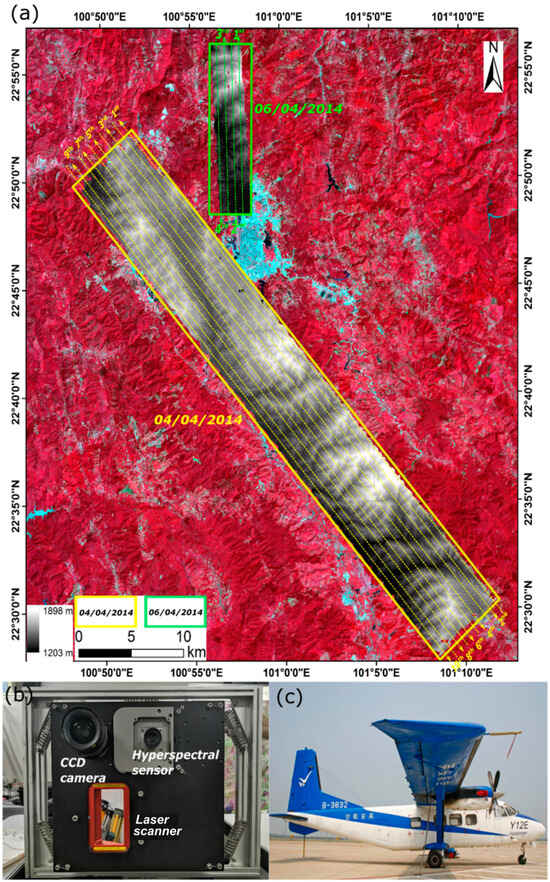 (a) Location of the study area and schematic map of the 04 April 2014 (yellow) and 06 April 2014 (green) flight-lines overlying the 14 April 2014 false-color Landsat 8 OLI image (path/row = 130/044, bands 5, 4, 3) and airborne LiDAR-derived digital elevation model (DEM). (b) The CAF-LiCHy airborne system flown on the (c) Harbin Y-12E aircraft.