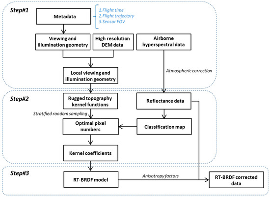The procedure comprises the following three main steps: (i) calculate the rugged topography kernel functions based on local viewing and illumination geometry; (ii) calculate the kernel coefficients of the RT-BRDF model for each spectral band and each forest type; and (iii) apply the RT-BRDF model to correct for the anisotropy effects of airborne hyperspectral data. The detailed processing chain is described in Figure 2.