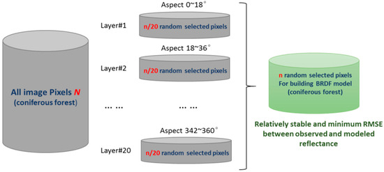 VHR airborne hyperspectral images generally contain a large number of pixels. For the purpose of an efficient processing and in order to obtain a comprehensive coverage of the viewing and illumination angles, a stratified random sampling method [84,85] was used to select a subset of pixels for the BRDF model fitting. For instance, under the assumption that the data set used in this study included a high number of pixels (N) in coniferous forest covered areas, a subset of n pixels were chosen from the N pixels (with n << N, with N ≈ 18,500,000 in this case) to build the BRDF model for coniferous forest in our study according to the following sampling rules (Figure 3):